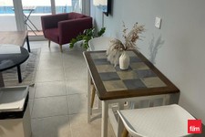 The apartment boasts a fully furnished kitchen equipped with modern appliances, including a washer/dryer. The spacious living room features plush furnishings and a large flat screen Smart TV, with an attached balcony offering incredible views.