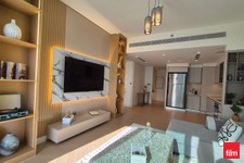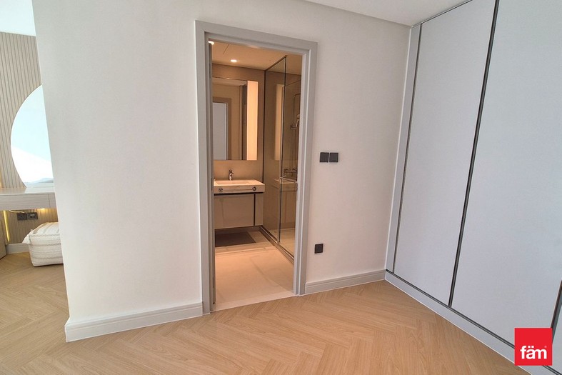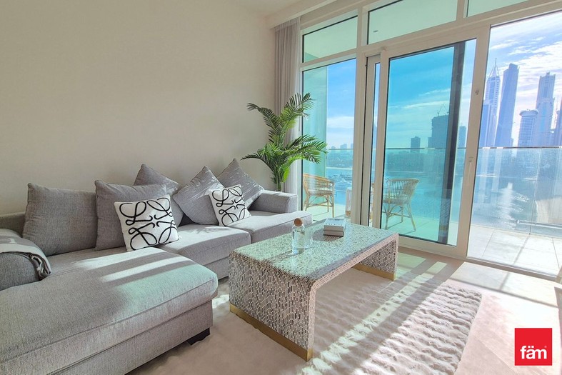 Step into a beautifully renovated home featuring an open kitchen equipped with modern kitchen appliances, seamlessly flowing into a bright living area that opens onto a private balcony — the perfect spot to unwind while soaking in uninterrupted views of the serene oceanfront and the vibrant Dubai skyline.